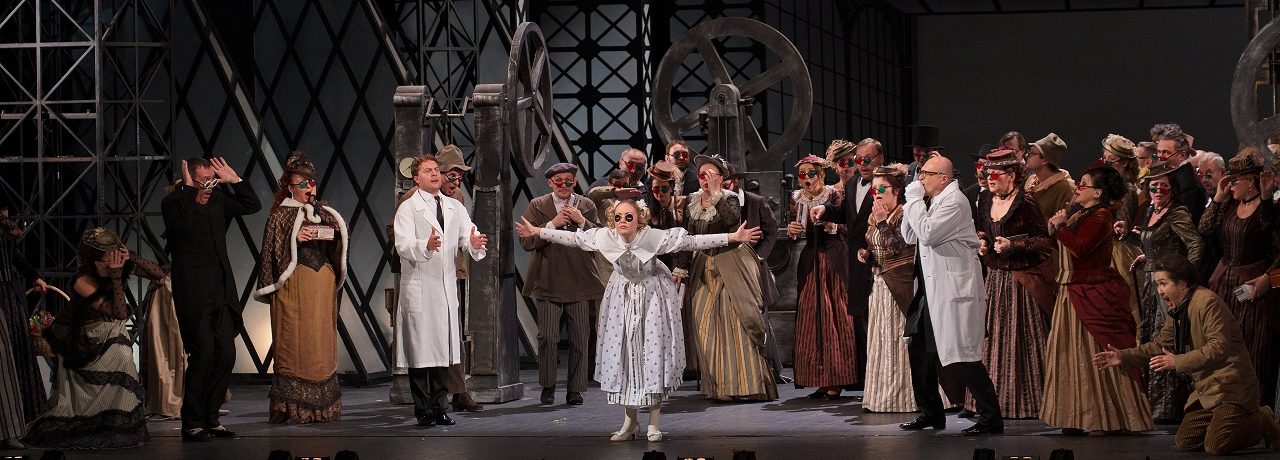 The time comes to demonstrate Olympia’s talents. The guests listen to the charming little song she performs for them. Hoffmann is enchanted by her voice and declares his love. Olympia responds only in monosyllables—but the magic spectacles do their work…