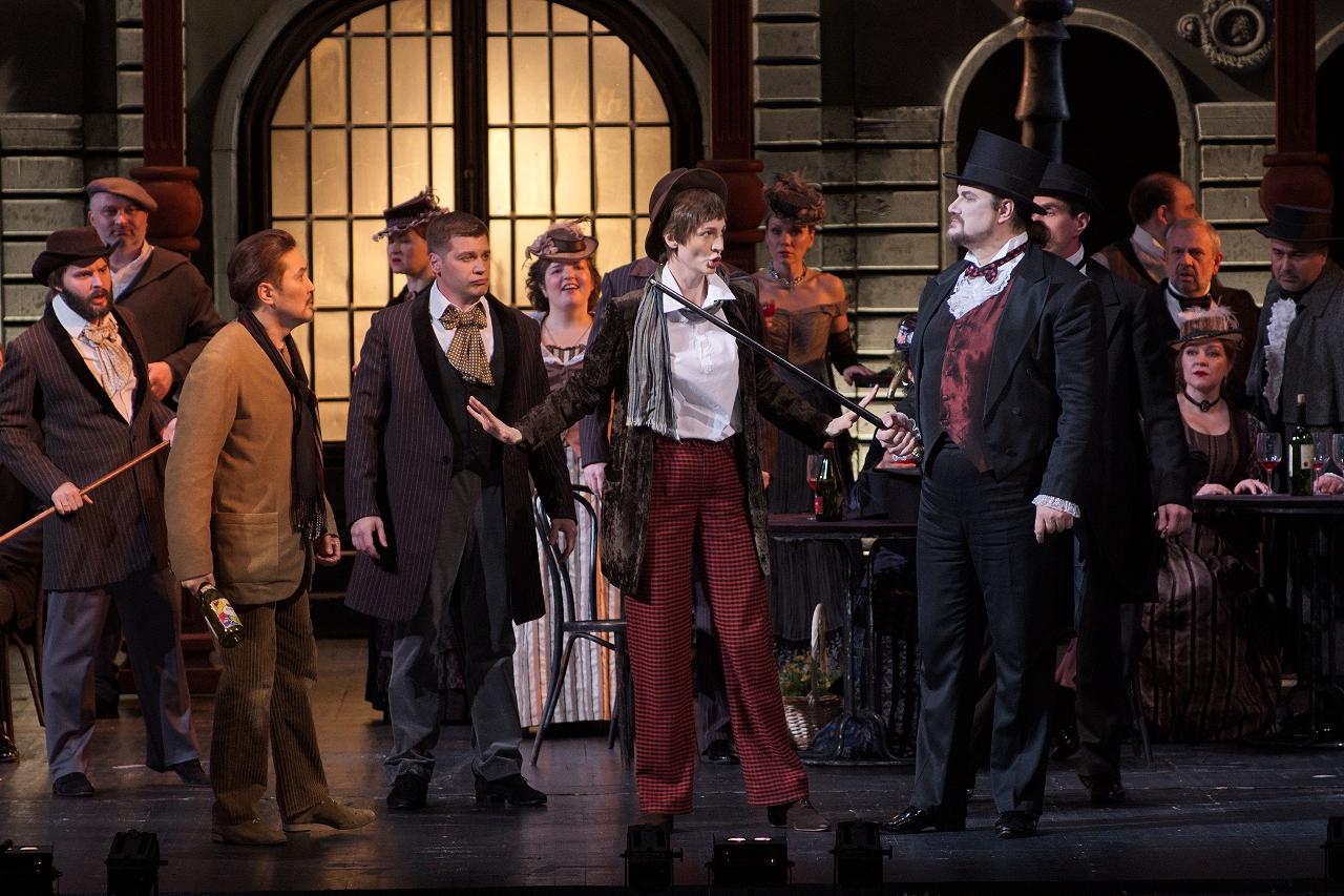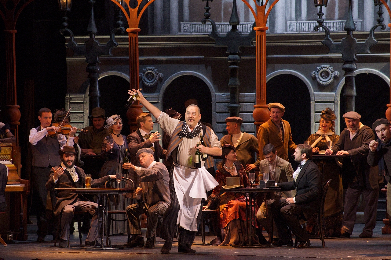 Hoffmann enters with his loyal companion Nicklausse. The regulars of the café look forward to an entertaining evening: Hoffmann is famous for his inexhaustible wit. At his friends’ request, he sings a humorous song about Kleinzach. Yet Hoffmann’s thoughts are fixed on Stella. He begins to mix up the verses, singing now not about Kleinzach but about his beloved. One of the poet’s friends, Nathanael, assures everyone that Hoffmann is once again in love. Hoffmann merely laughs it off.