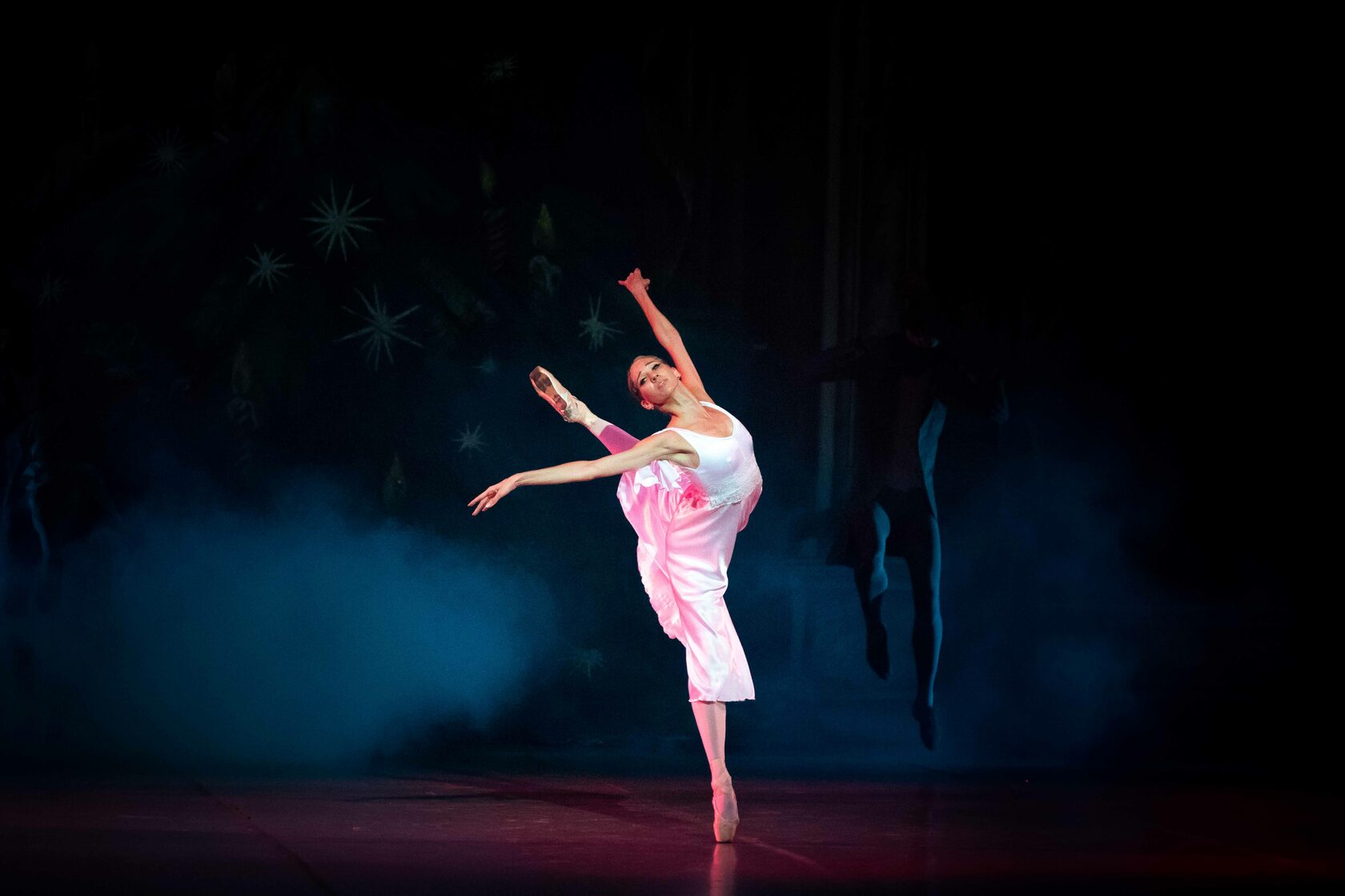 The walls of the house disappear. Marie and her friends are standing under a star-studded sky, by a fairy-tale Christmas tree. Snowflakes go round in a magical dance. Marie and her Nutcracker-Prince, beckon, as if to a beautiful dream, to the twinkling star at the top of the Christmas tree. They climb into a magic boat and set off for the top of the tree. The dolls follow behind them.