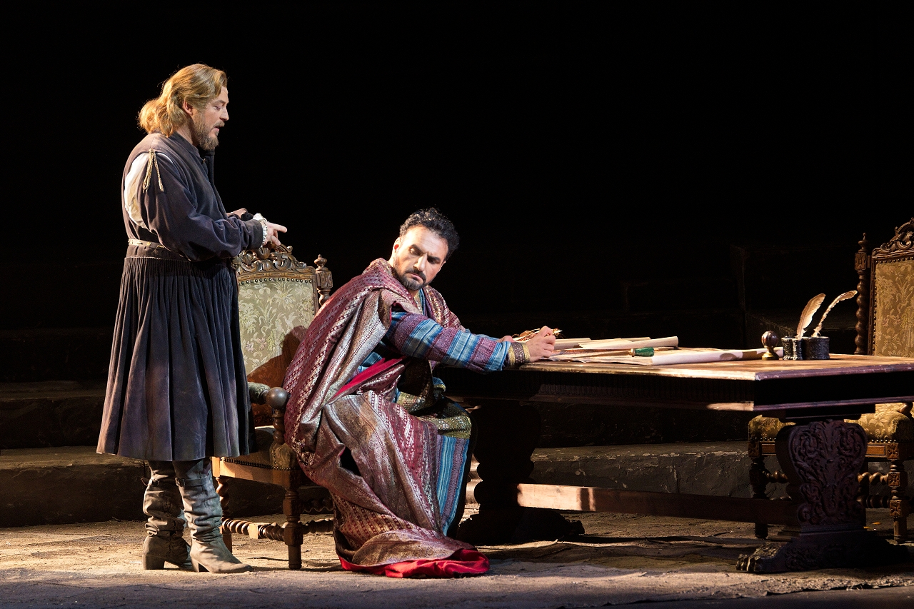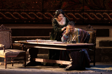 A delegation arrives from Venice. Othello is temporarily recalled, and Cassio is appointed in his place. Unable to control his fury, Othello insults Desdemona in public. Those around are stunned. Iago triumphs.